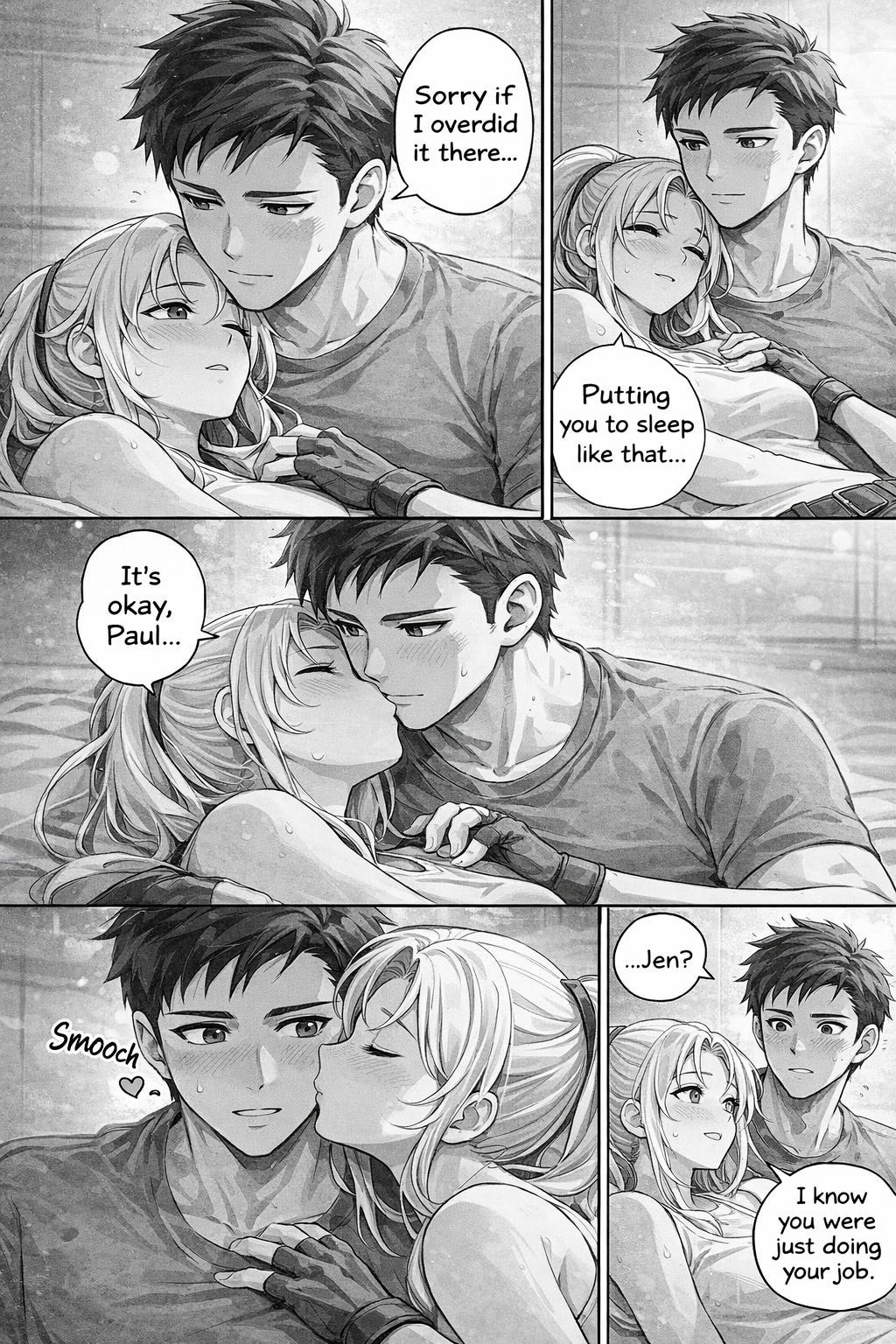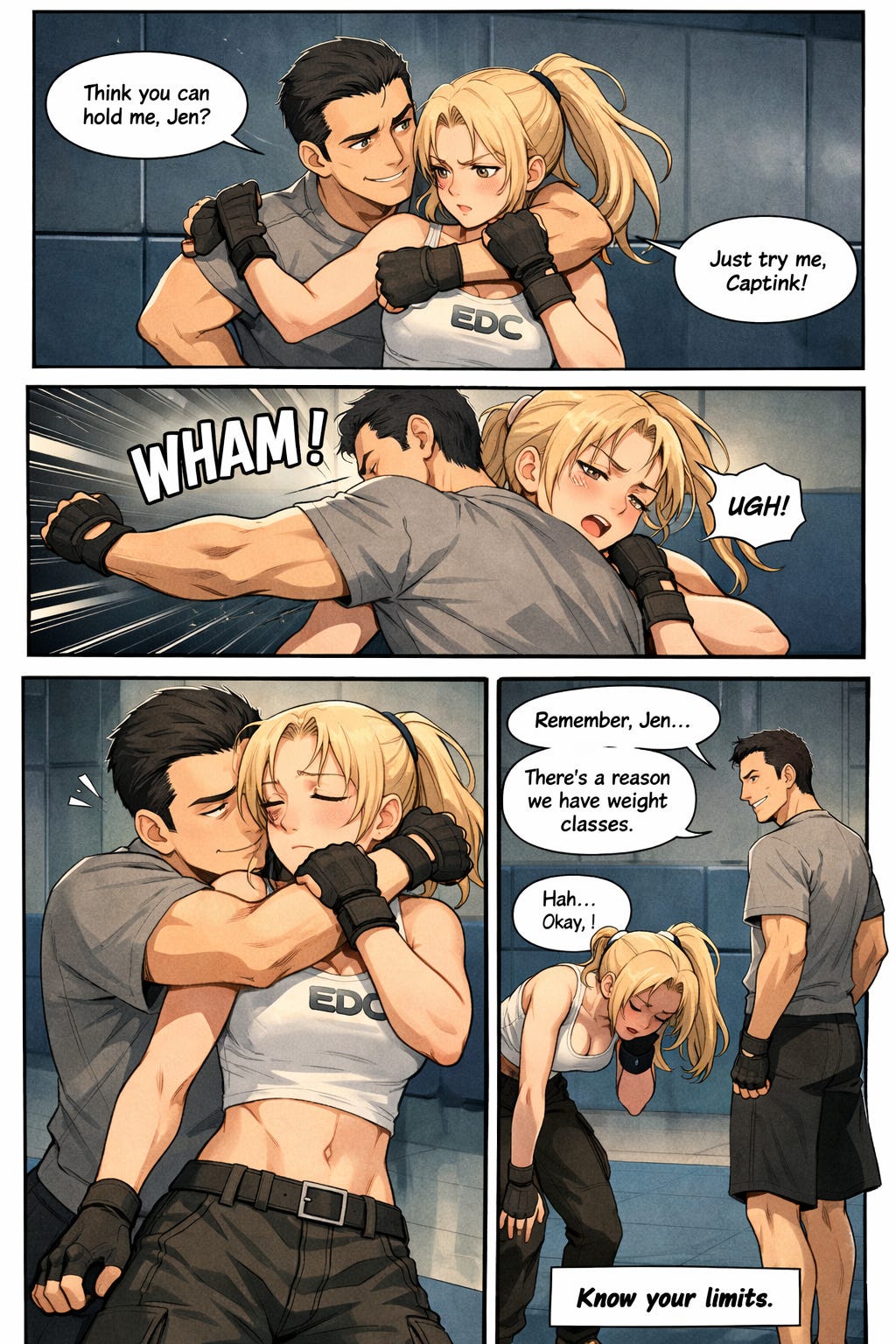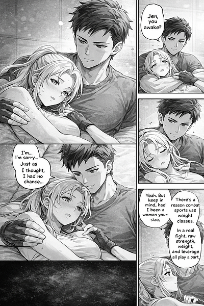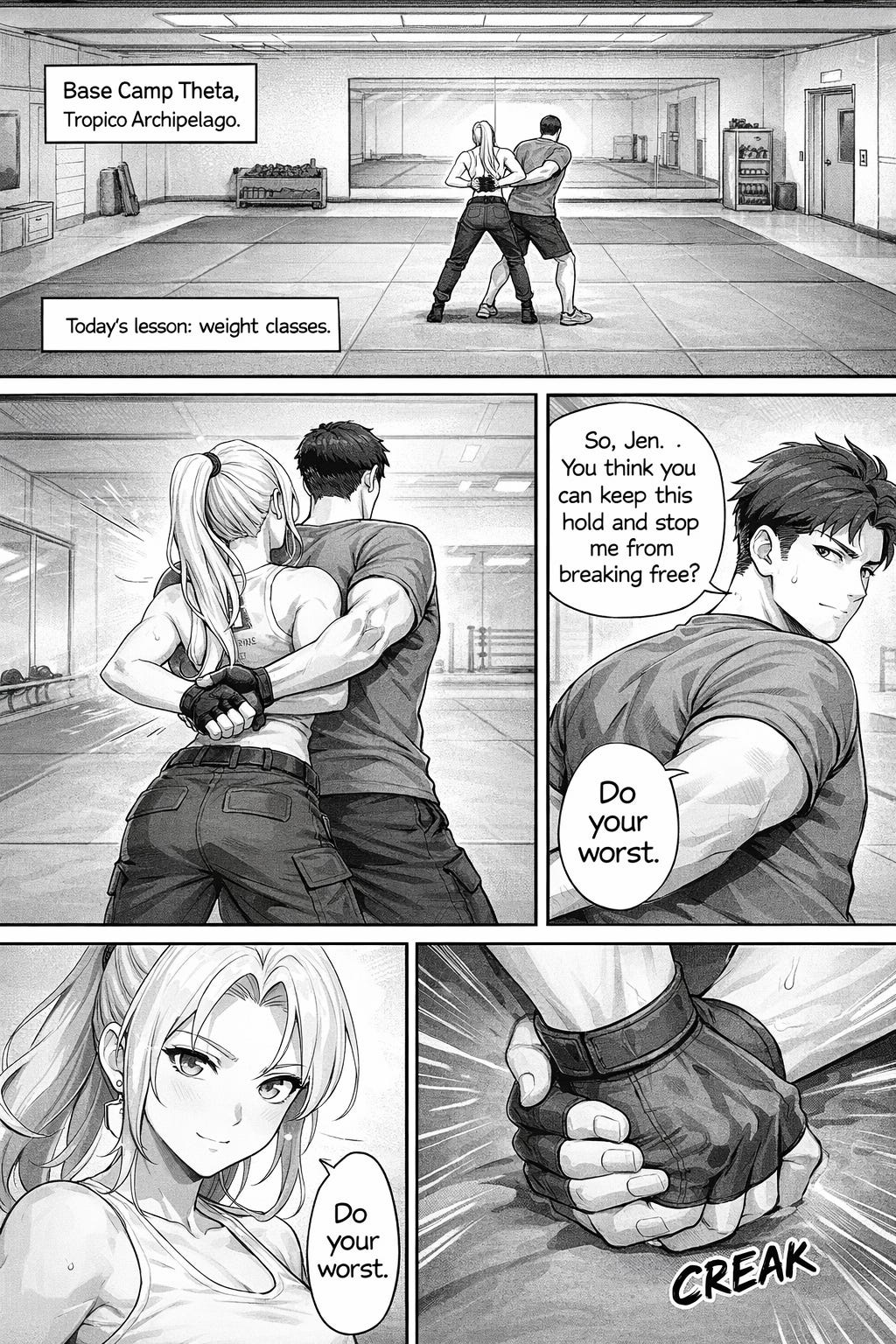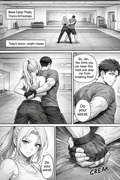 So I decided that instead of trying to get the robot to visualize whole stories, I might have a better time visualizing a scene. So I did just that. The following comic is about Jen’s training with her CO and totally-not-love-interest Captain Paul Sobieski.