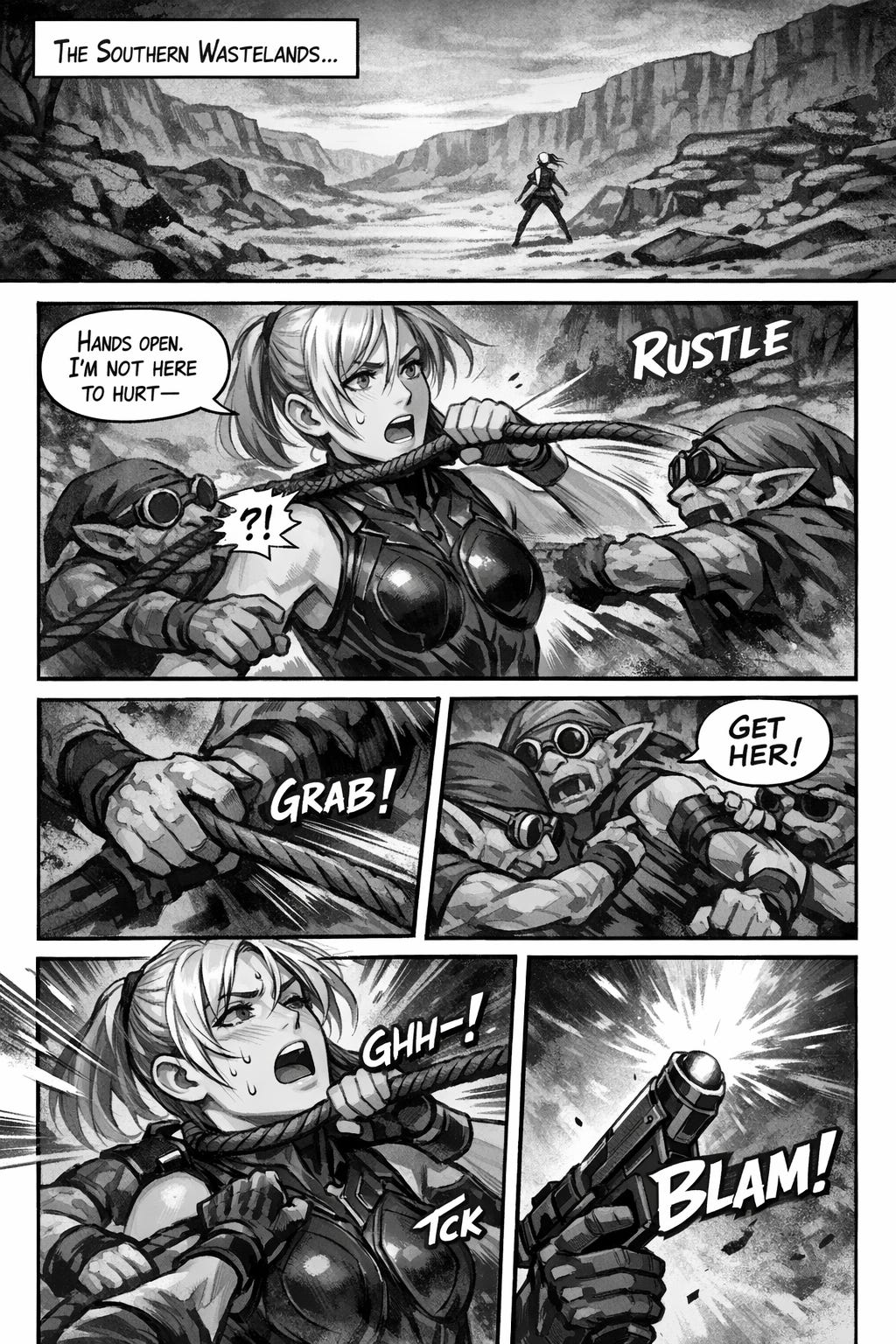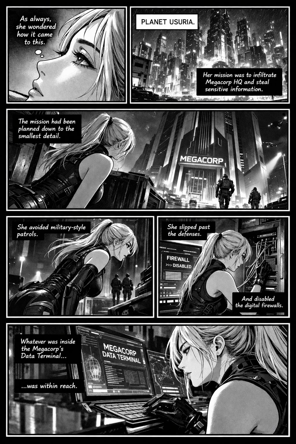 Now for something completely different. This one is not a full-on comic but just a bunch of panels (two exactly) based on the short story Weight Class. Like with Prisoner of the Megacorp, the robot ended up going off the rails. And honestly, I didn’t like what I got even after I got it back on track, so instead I just kept two of the pages that I liked.